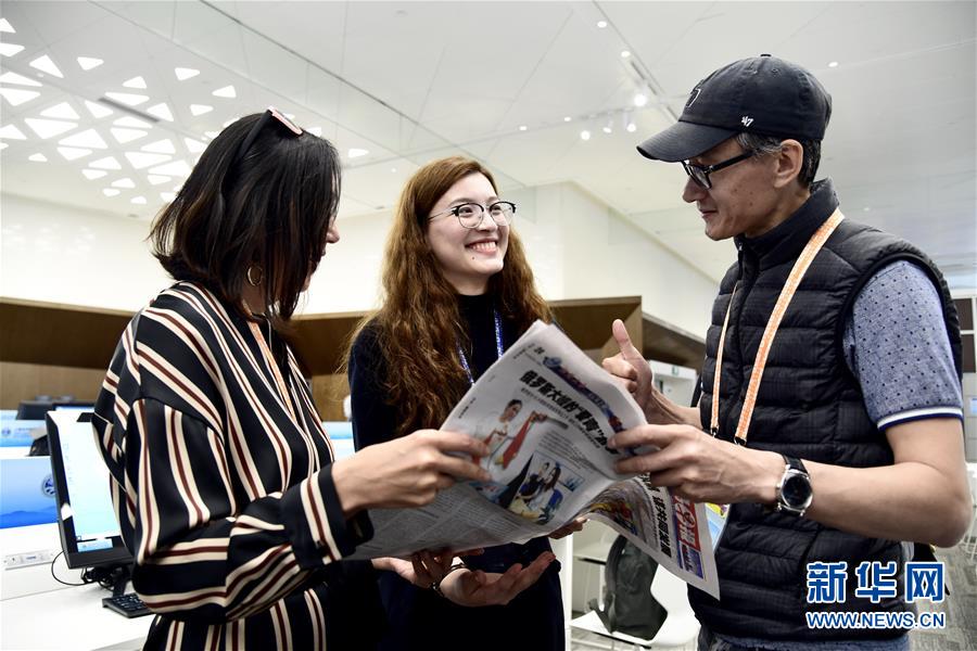 6月8日,在上合青岛峰会新闻中心,哈萨克斯坦官方媒体记者叶斯姆(右一)对媒体刊登的关于珍珠的报道点赞。 新华社记者郭绪雷摄