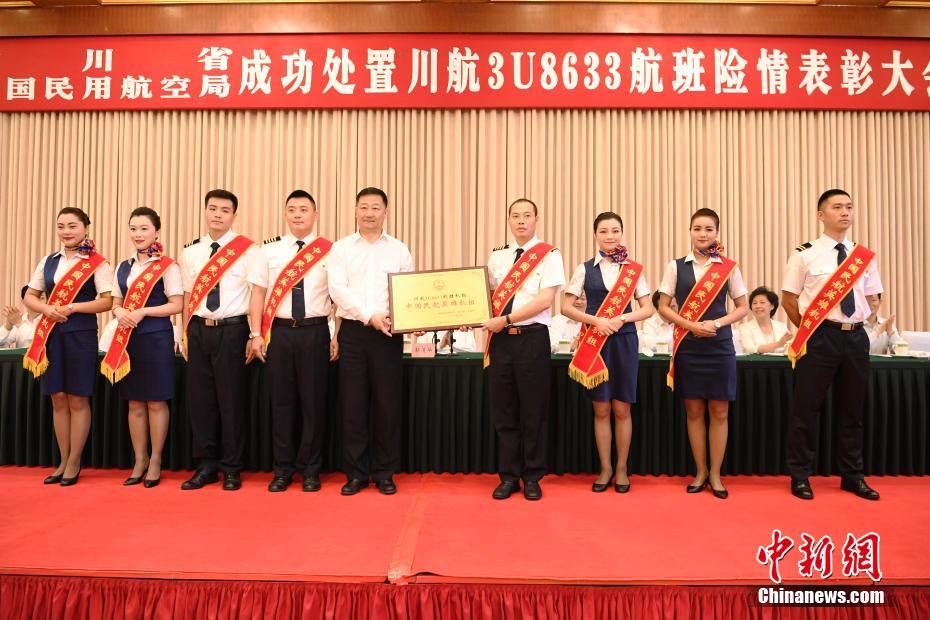 6月8日,四川省、中国民用航空局在成都举行成功处置3U8633航班险情表彰大会。川航3U8633航班机组被授予“中国民航英雄机组”称号,机长刘传健被授予“中国民航英雄机长”称号,并享受省级劳动模范待遇。 中新社记者 安源 摄