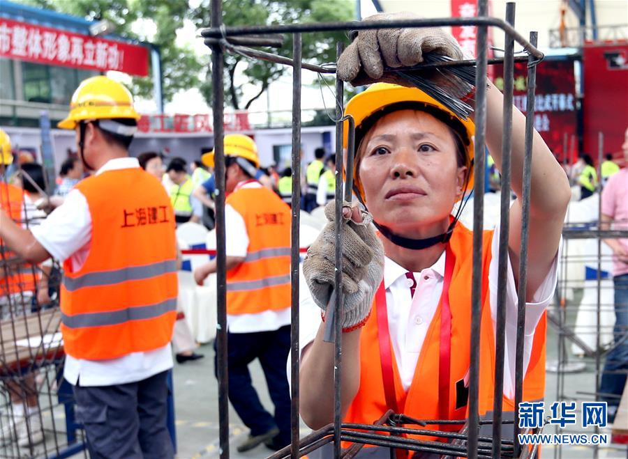 6月8日,职工在活动中进行钢筋绑扎比赛。当日,上海建工集团举办职工技能比武活动,活动项目包括建筑测量、钢筋绑扎等8个方面,共有350多名岗位能手参加。 新华社记者 凡军 摄