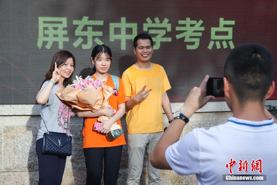 6月8日下午5时,为期两天的2018年全国统一高考在大部分地区落幕。随着考试结束铃声的响起,考生门纷纷走出考场,迫切地寻找自己的亲人,第一时间与他们分享高考结束的喜悦。据统计,今年全国高考报名考生共975万人,福建20万人参加高考。图为考生和家长合影留念。 李南轩 摄