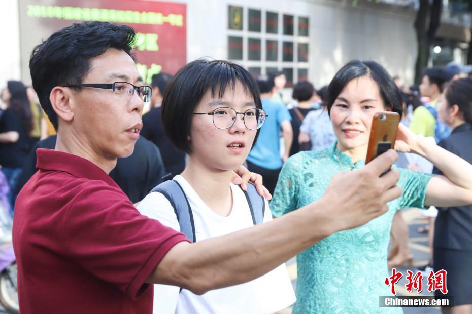 6月8日下午5时,为期两天的2018年全国统一高考在大部分地区落幕。随着考试结束铃声的响起,考生门纷纷走出考场,迫切地寻找自己的亲人,第一时间与他们分享高考结束的喜悦。据统计,今年全国高考报名考生共975万人,福建20万人参加高考。图为最后一门考试结束后一名考生和家长在学校门口合影。 李南轩 摄