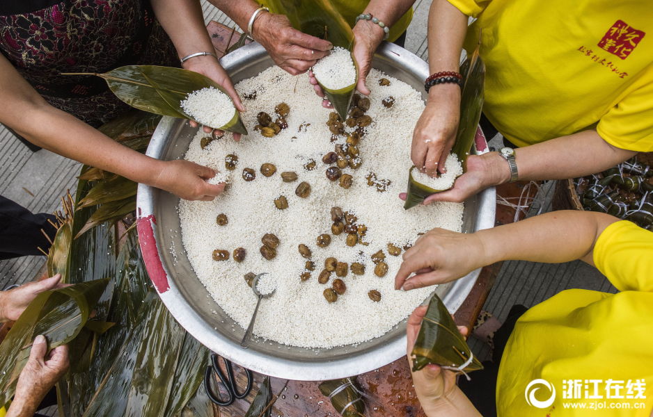 6月10日,“我的礼堂 我的家”端午文化周活动在温岭彭家村拉开序幕,村民们齐聚文化礼堂,包粽子、做香囊、观赏演出,提前度过了一个充满家乡味道的端午节。(浙江在线拍友 朱海伟 摄)