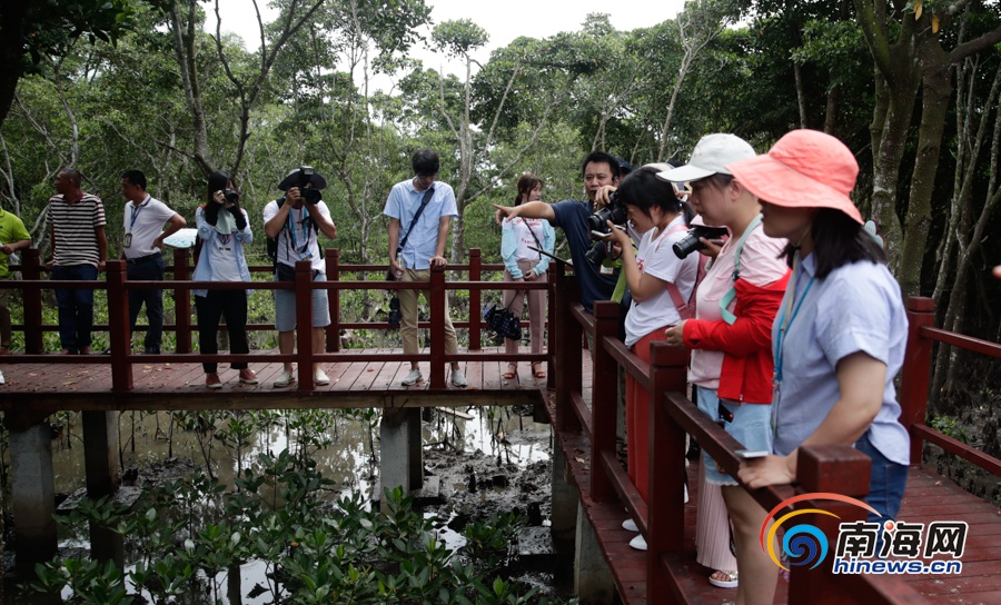 记者在海口东寨港红树林国家级自然保护区采访。南海网记者刘洋 摄