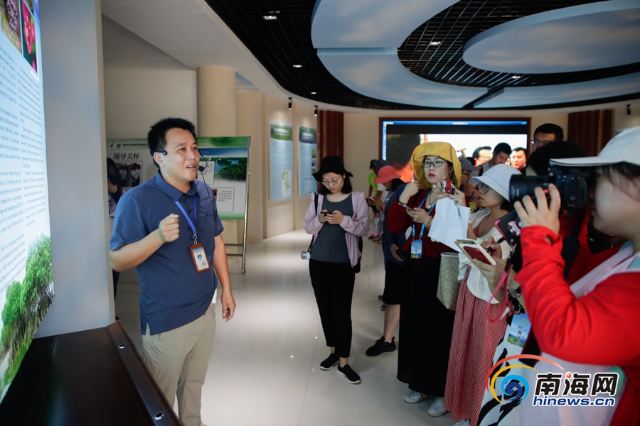 工作人员冯尔辉向记者介绍红树林。南海网记者刘洋 摄