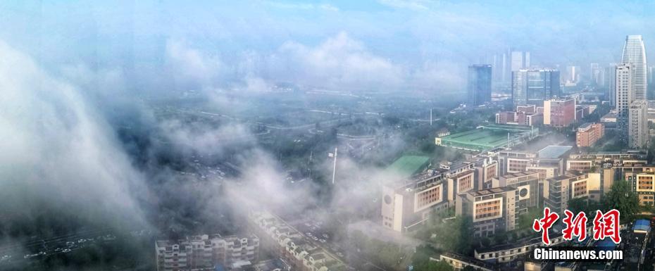 6月12日清晨,成都城区东面出现“平流云”景象,一些楼宇被雾气包围或笼罩,宛如仙境。平流云是当较暖的气团经过一个较冷的下垫面(如冷水湖)时所形成。 刘忠俊 摄