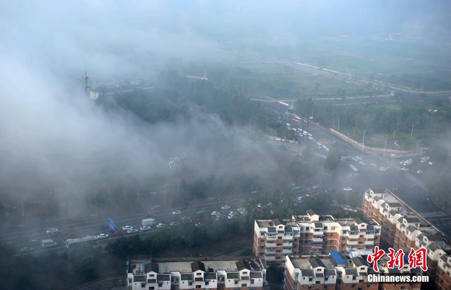 6月12日清晨,成都城区东面出现“平流云”景象,一些楼宇被雾气包围或笼罩,宛如仙境。平流云是当较暖的气团经过一个较冷的下垫面(如冷水湖)时所形成。 刘忠俊 摄