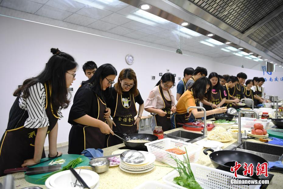 6月12日,学生在《食话食说》选修课上学习。四川成都一高校开设了一门名为《食话食说》的选修课,由国家级烹饪大师担任主教,学校食堂的经理或厨师长担任助教,这门课程为2个学分,共32个学时,学生每节课将学习两道经典菜肴的历史和制作方法。中新社记者 安源 摄