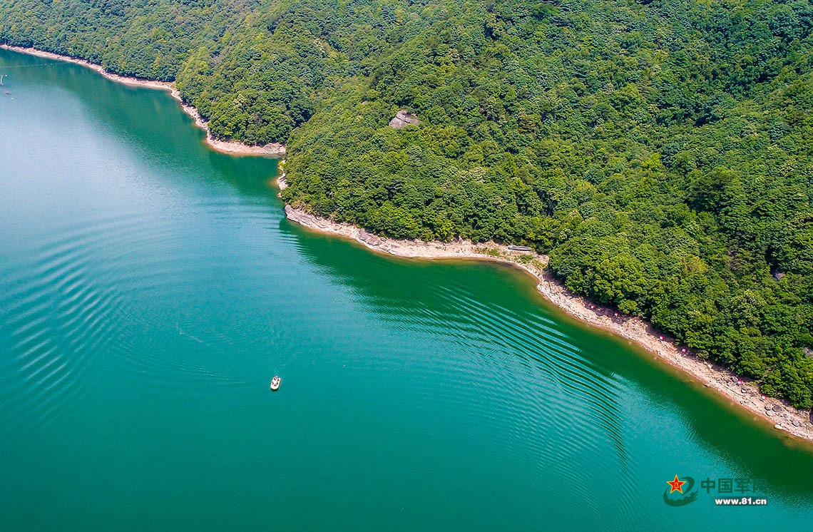 水上射击用的白舟映衬在碧绿的湖面上。殷福军 摄