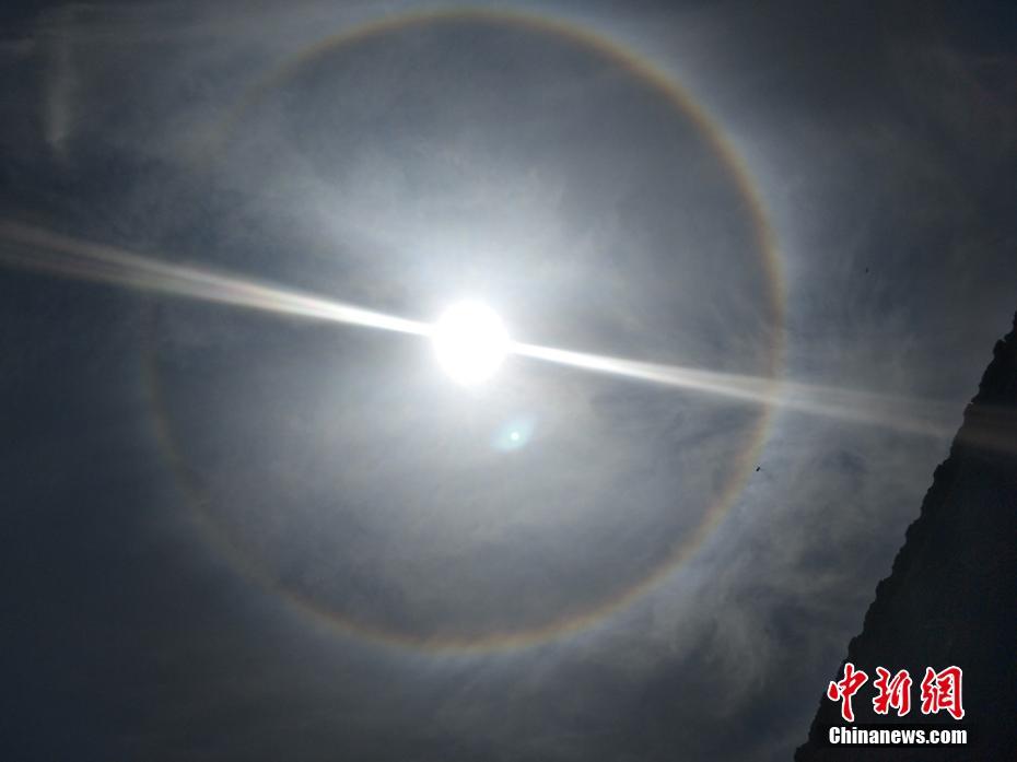 6月13日中午,甘肃平凉市上空出现难得一见的日晕景象,一个颜色较淡的巨大彩色光环环绕着太阳,绚丽无比,引得市民纷纷拿起手机、相机观赏拍照。吴希会 摄