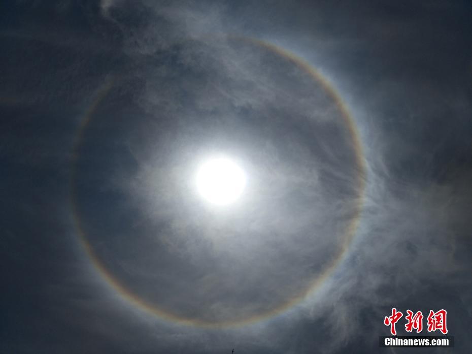 6月13日中午,甘肃平凉市上空出现难得一见的日晕景象,一个颜色较淡的巨大彩色光环环绕着太阳,绚丽无比,引得市民纷纷拿起手机、相机观赏拍照。吴希会 摄