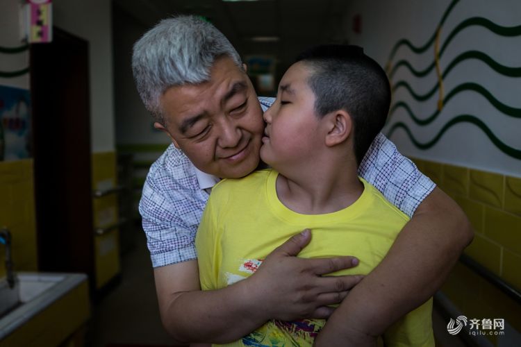 2015年5月18日,北京,今天,心心的家长陪他上学,在培智学校,家长可以陪护孩子。心心和爸爸一直很亲。