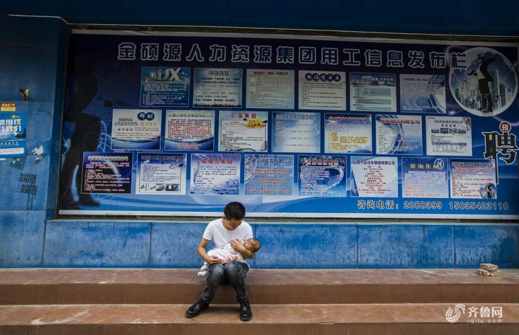 2015年06月15日,山西省运城市,王小明在找工作,抱着孩子的他不知道是否会有企业录他。陈卫 摄