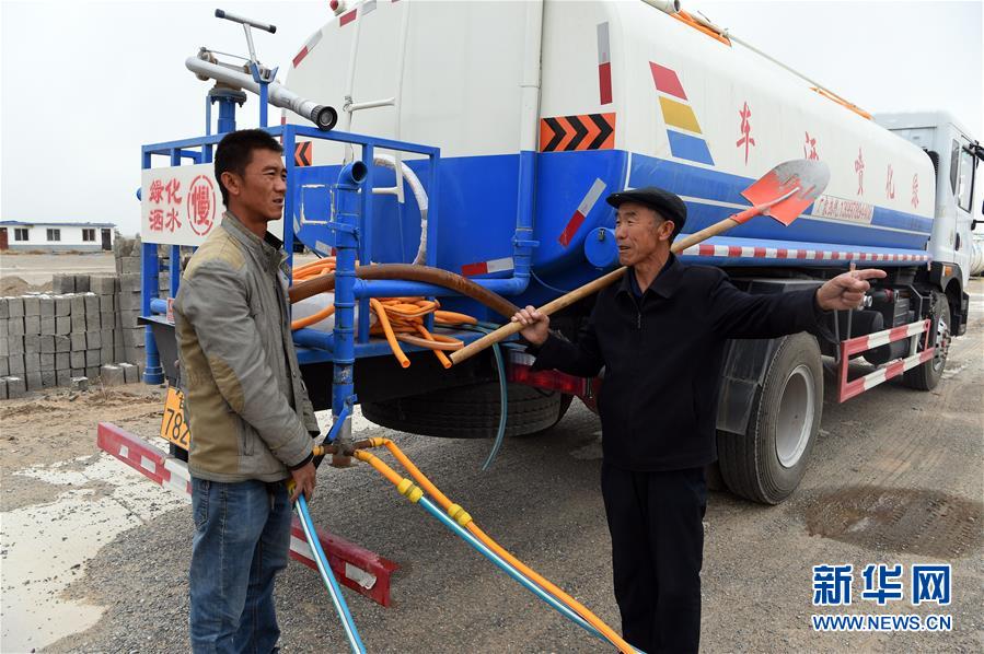 在八步沙林场,郭万刚(右)交代侄子郭玺当天负责浇水的范围(5月21日摄)。2017年春天,郭万刚的侄子郭玺加入林场,成为八步沙第三代治沙人。八步沙,位于腾格里沙漠南缘,是甘肃省古浪县最大的风沙口。20世纪80年代,沙化以每年7.5米的速度向村庄和农田推进。当地六位年龄加在一起共300多岁的老汉,在一份承包沙漠的合同书上按下手印,誓用白发换绿洲。 37年过去,六老汉的后代“六兄弟”接过父辈的铁锹,把黄沙变林场,把林场变公司。而今,他们在沙漠里封沙育林达35万亩,植树3000万株。八步沙,昔日的风沙口变成绿意盎然的沙漠观光林场,一到四五月份,柠条、沙棘、红柳竞相花开,缤纷一片。 “六兄弟”曾经印过一张名片,背后是一幅绿茵茵的生态家园图:山岳染绿,花开点点,雁阵轻翔。那是治沙人不懈追求的美丽梦想。“六兄弟”幸运地赶上了这个“绿水青山就是金山银山”的新时代,他们的梦想正逐步变成现实。新华社记者 范培珅 摄