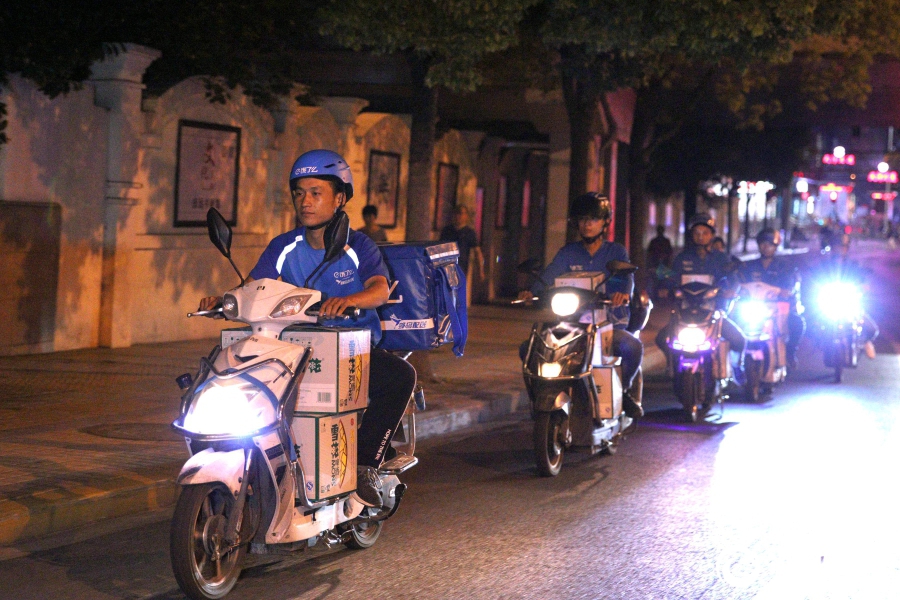 配送队列。送餐箱里可以放一箱,每辆摩托车脚踏板前可以叠放三箱。