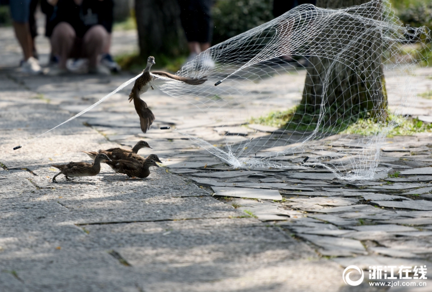 全国鸟类环志中心的专家用网枪将小鸳鸯暂时控制。