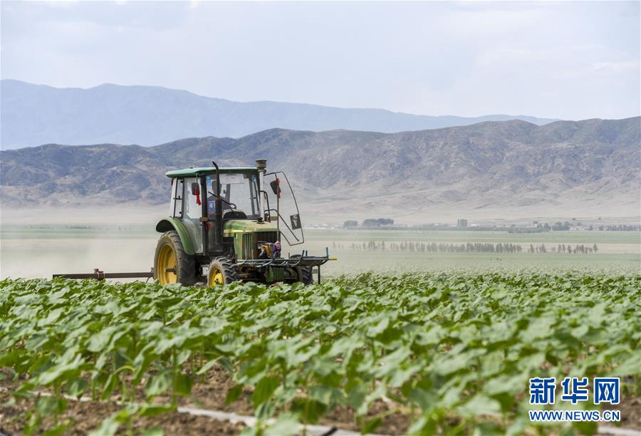 村民在新疆塔城地区额敏县喀拉也木勒镇一处种植食葵的农田中除草。近年来,克什克尼托别村大力推行土地流转,村民按自愿原则将土地承包给种植大户,收取承包费用。新华社记者 胡虎虎 摄