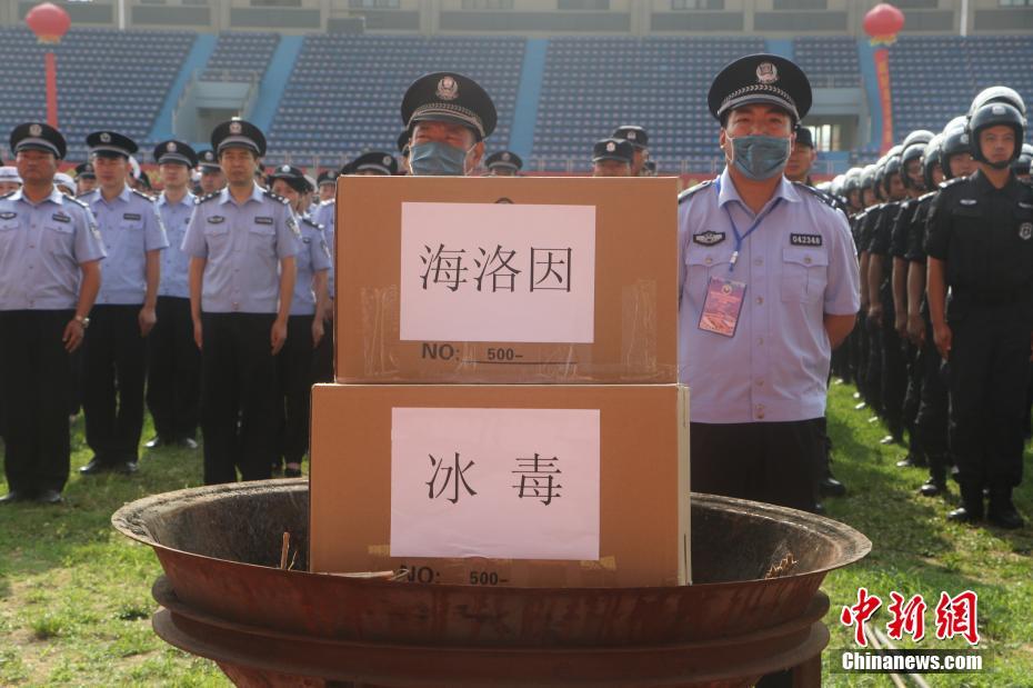 6月23日,“6.26”国际禁毒日将来临之际,安徽省禁毒重点整治攻坚誓师大会在该省临泉县举行,警方现场公开焚烧海洛因、冰毒、吗啡等各类毒品297公斤。 中新社记者 赵强 摄