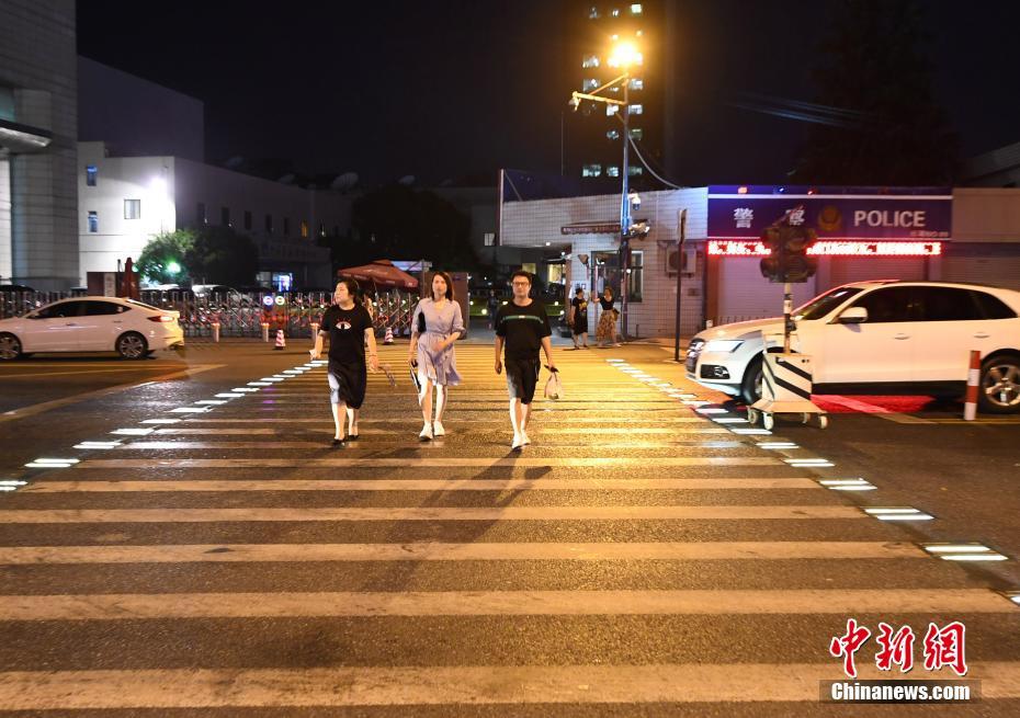 6月25日,几位市民过街时斑马线自动亮灯。近日,浙江杭州街头现“暖心”智能设计,行人过街时,斑马线上的智能设备会自动感应并亮起地面灯,为行人照亮路面、提醒车辆减速慢行,保障行人的安全。中新社记者 王刚 摄