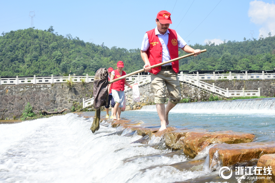 6月25日,建德市下涯镇党员治水先锋队的志愿者,来到下涯村大洲溪段开展生态环保巡溪护水行动,打捞漂浮在水面上的垃圾,清理滩涂上的杂物,确保一江清水送下游。(浙江在线拍友 宁文武 摄)
