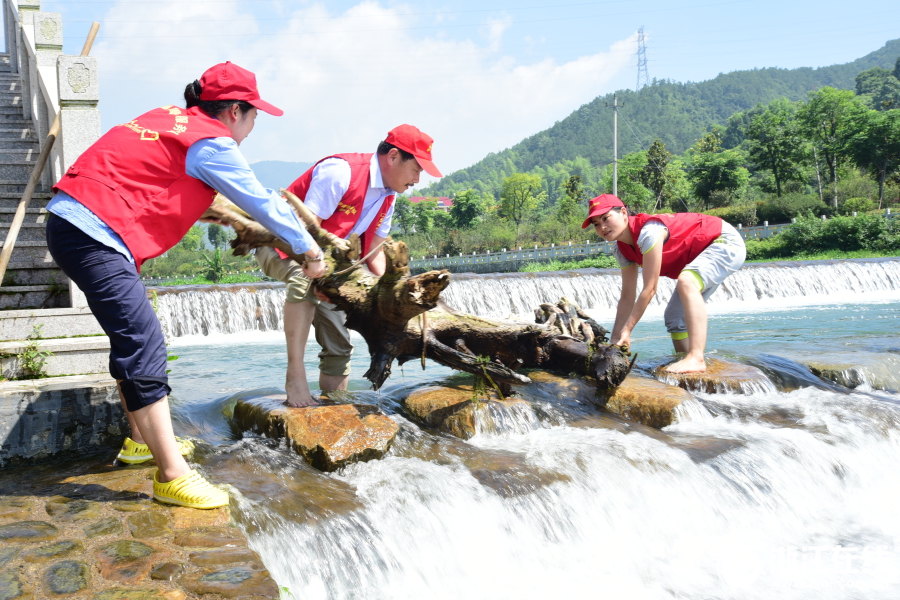 6月25日,建德市下涯镇党员治水先锋队的志愿者,来到下涯村大洲溪段开展生态环保巡溪护水行动,打捞漂浮在水面上的垃圾,清理滩涂上的杂物,确保一江清水送下游。(浙江在线拍友 宁文武 摄)
