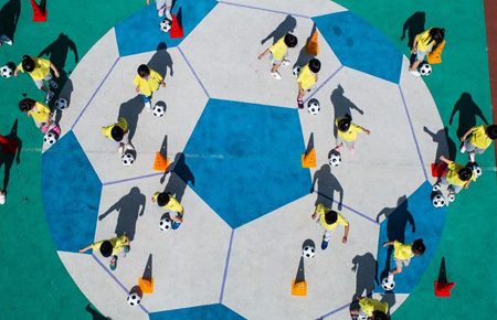 6月26日,长兴县中心幼儿园的孩子们在参加校园“足球节”的趣味足球游戏。当日,浙江省湖州市长兴县中心幼儿园举办以“快乐足球”为主题的暑期校园“足球节”。本次活动以足球为载体,以游戏为手段,以健康成长为目的,在“玩”和“动”的过程中培养幼儿对足球的兴趣,丰富暑期生活。新华社记者徐昱摄