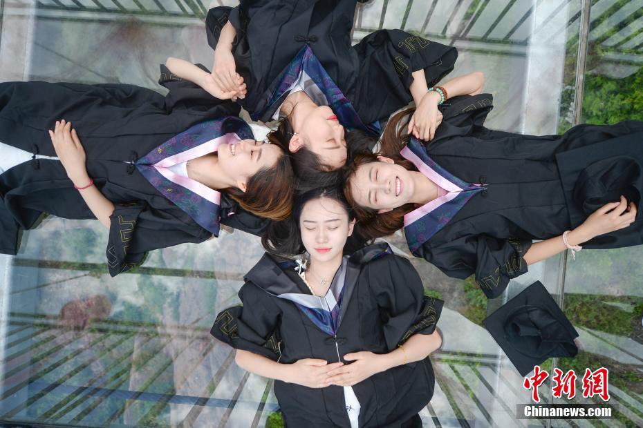 6月27日,来自湖南长沙的20余位高校毕业生,身着学士服在湖南平江石牛寨透明玻璃桥上拍起了高空创意毕业照,以此纪念自己的四年大学时光。杨华峰 摄