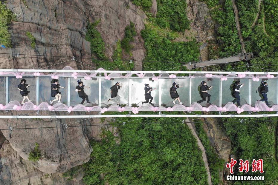 毕业生在玻璃桥上拍创意毕业照。杨华峰 摄