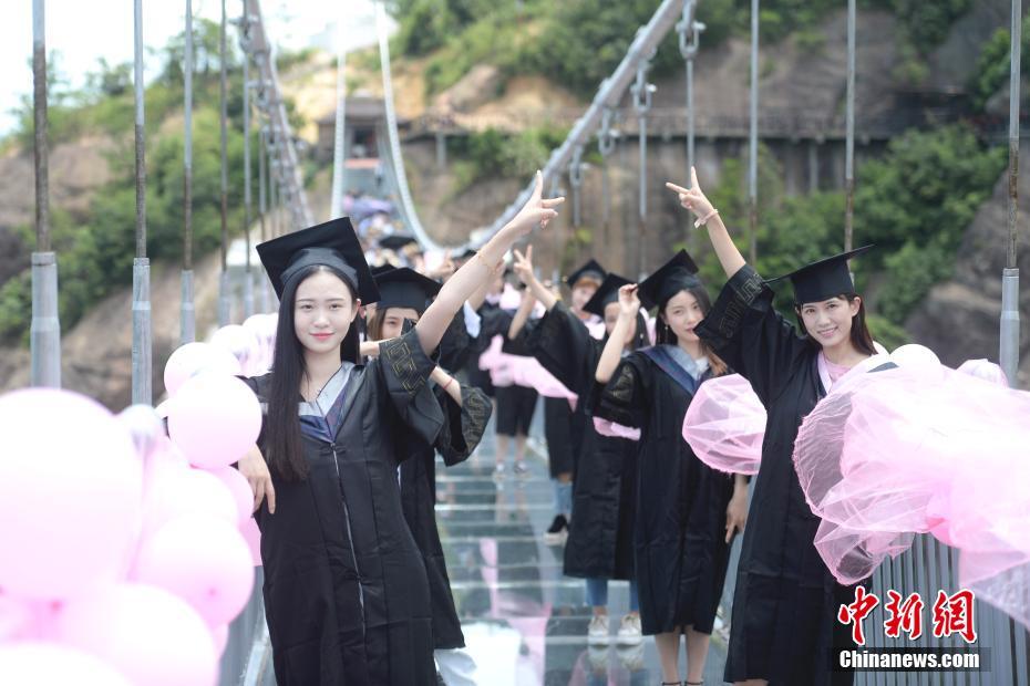 毕业生身着学士服在玻璃桥上拍起了毕业照。杨华峰 摄