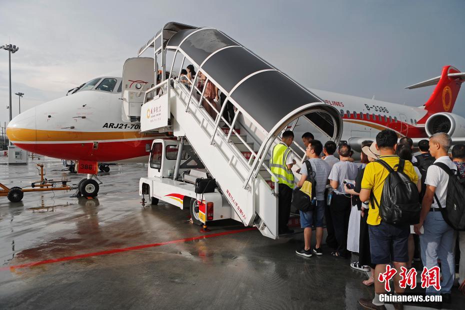 6月28日,旅客在成都双流国际机场排队乘坐ARJ21支线客机前往上海。当日,中国商飞ARJ21支线客机运营迎来两周年,同时,由成都航空运营的ARJ21飞机迎来第10万名乘客。这标志着ARJ21新支线客机基本实现安全顺畅运营目标,航线运营取得阶段性成果。中新社记者 殷立勤 摄