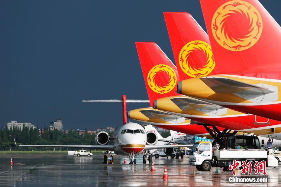 6月28日,成都航空运营的ARJ21飞机停在成都双流国际机场等待执行航班任务。当日,中国商飞ARJ21支线客机运营迎来两周年,同时,由成都航空运营的ARJ21飞机迎来第10万名乘客。这标志着ARJ21新支线客机基本实现安全顺畅运营目标,航线运营取得阶段性成果。中新社记者 殷立勤 摄