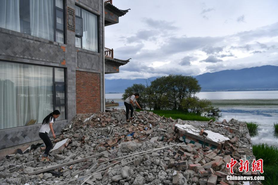 6月28日,大理洱海边一海景客栈正被拆除。当日,云南省大理市环洱海周边的大部分客栈、餐馆仍然关停,部分处在洱海流域水生态保护区核心区内的客栈、餐馆已经自行拆除。2017年,大理州开启了洱海保护治理“七大行动”,划定了洱海流域水生态保护核心区,开展违章建筑整治等多项举措。中新社记者 任东 摄