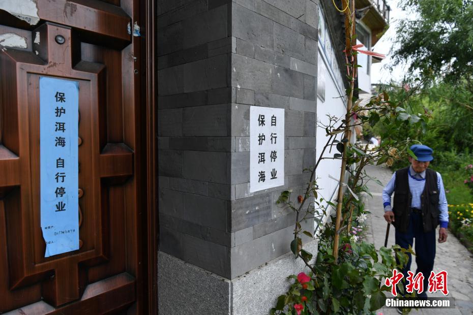 6月27日,大理洱海边客栈贴着“保护洱海自行停业”的告示。当日,云南省大理市环洱海周边的大部分客栈、餐馆仍然关停,部分处在洱海流域水生态保护区核心区内的客栈、餐馆已经自行拆除。2017年,大理州开启了洱海保护治理“七大行动”,划定了洱海流域水生态保护核心区,开展违章建筑整治等多项举措。中新社记者 任东 摄