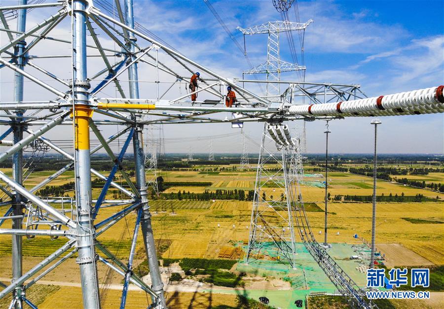 6月29日,施工人员在做投运前的复检验收工作(无人机拍摄)。当日,雄安新区首个大型电网建设工程——1000千伏定河线迁改工程建成投入运营。该工程跨越拟建的京雄城际高铁、京港台高铁。新华社记者 李晓果 摄 图片来源:新华网