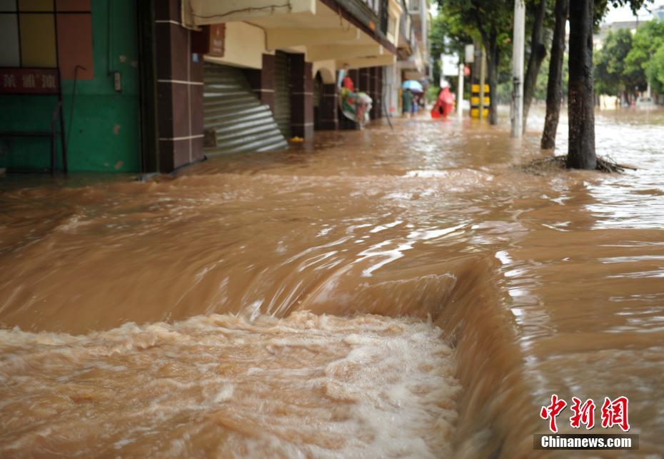 7月2日,成都蒲江县境内遭遇大暴雨和洪水袭击,大量果树、农田、民房等进水被淹,灾害致14082人受灾,紧急转移被困民众9565余人,直接经济损失约3426.46万元人民币,暂未收到人员伤亡报告。图为成都蒲江县寿安镇老街进水被淹,街上的人行道已成河道。中新社记者 刘忠俊 摄
