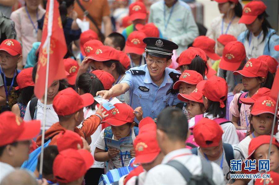7月3日,在永济北站,一名民警向候车的留守儿童发放安全乘车手册。当日,在山西运城永济市举办的“爱在路上”亲情护送活动中,260余名留守儿童在志愿者的护送下从火车永济北站出发,前往北京与父母团聚。新华社发(李向东 摄)
