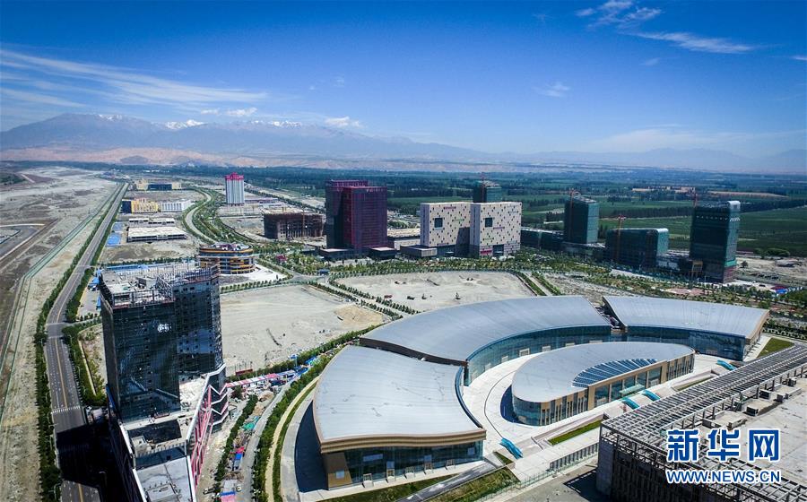 这是从空中俯瞰中哈霍尔果斯国际边境合作中心(6月28日无人机拍摄)。第二次中央新疆工作座谈会以来,特别是党的十九大召开以来,新疆坚决贯彻党中央关于新疆工作的大政方针,围绕社会稳定和长治久安总目标,加快经济发展和民生改善,促进民族团结和社会和谐,天山南北呈现安居乐业的良好局面。新华社记者 赵戈 摄