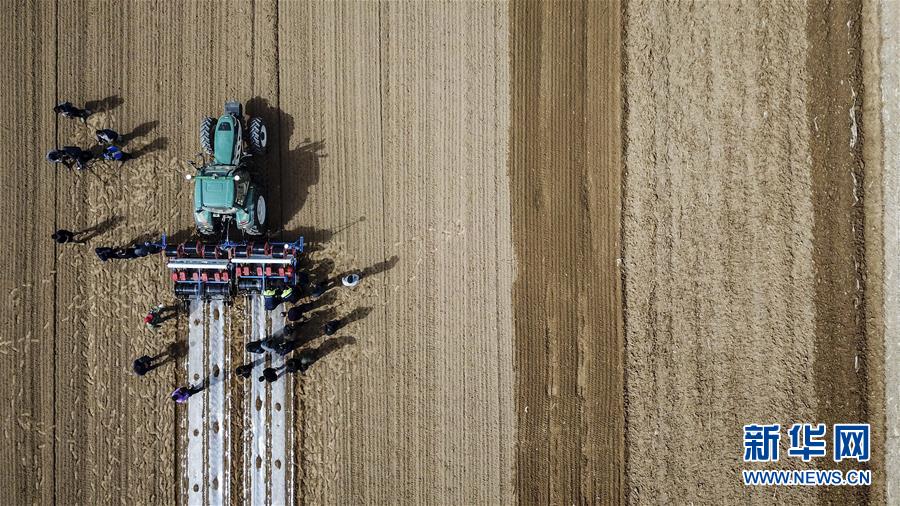 在新疆库车县牙哈镇的一处棉田里,村民使用搭载自动导航系统的“智能拖拉机”进行棉花播种作业(3月23日无人机拍摄)。第二次中央新疆工作座谈会以来,特别是党的十九大召开以来,新疆坚决贯彻党中央关于新疆工作的大政方针,围绕社会稳定和长治久安总目标,加快经济发展和民生改善,促进民族团结和社会和谐,天山南北呈现安居乐业的良好局面。新华社记者 胡虎虎 摄