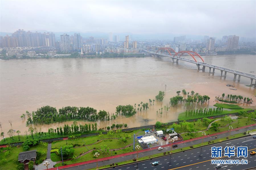 7月3日,在四川省南充市,嘉陵江南充主城区段洪峰过境,沿岸大量绿地被淹。 新华社发(乐校臣 摄)