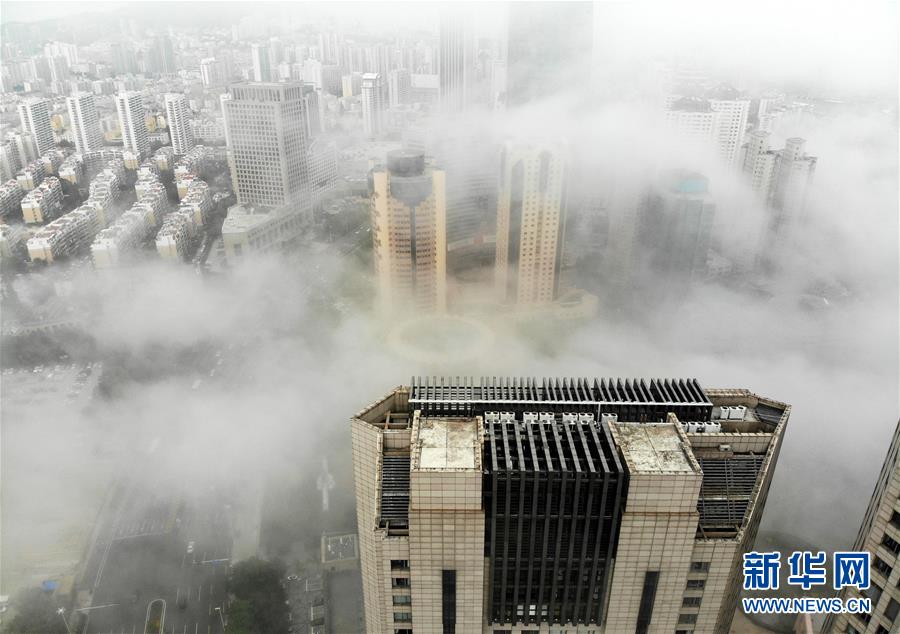 这是7月4日在青岛五四广场附近无人机拍摄的平流雾景观。 新华社记者 李紫恒 摄