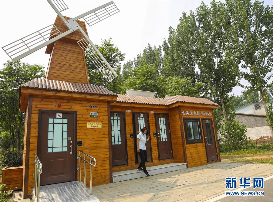 7月5日,市民从河北省大厂回族自治县一处“风车”造型公厕走出。