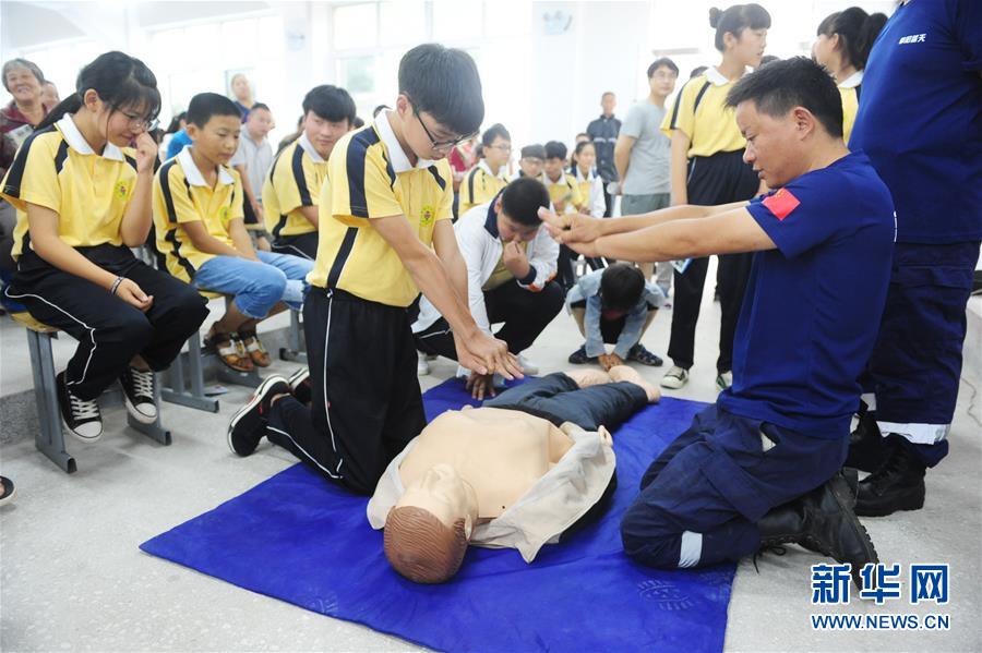 7月5日,在安徽省阜阳市颍东区袁寨镇中心学校,志愿者利用仿真人模型向学生介绍心肺复苏法。暑假期间,各地孩子们利用假期参加多种形式的课外活动,在实践中学习新技能。