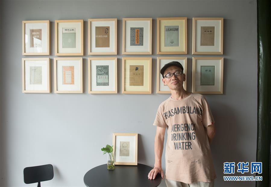 7月5日,荒原书店老板钱华在他收藏的书前留影。
