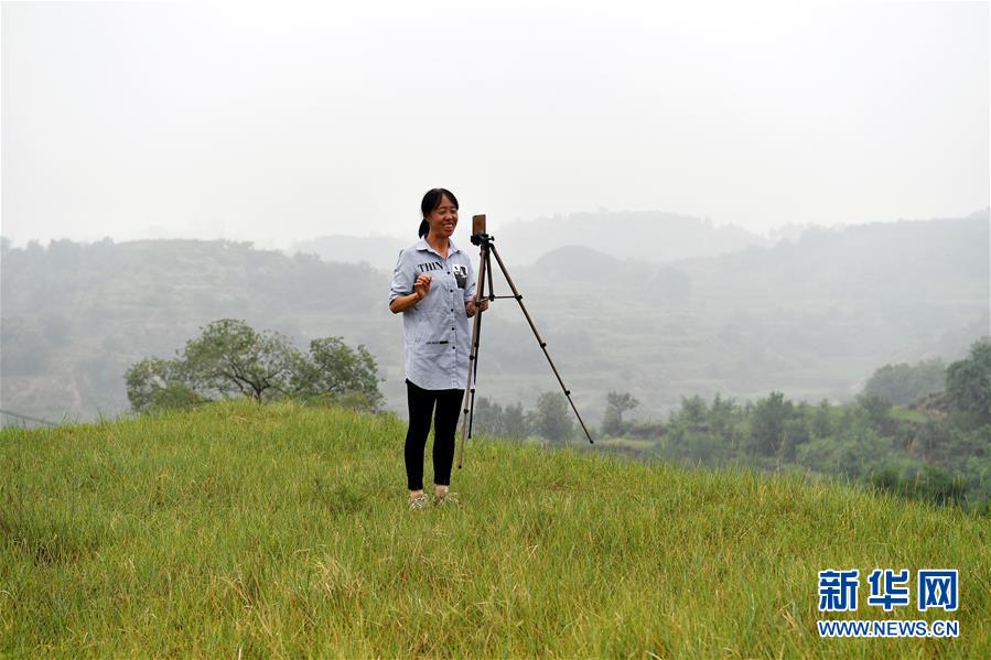 7月4日,在武乡县岭头村,李润红在网络直播村里的景色。2017年4月,李润红参加微商培训后,开始尝试卖自家的农产品。她采取“直播+销售”的方式,将自家的农产品卖到全国各地。