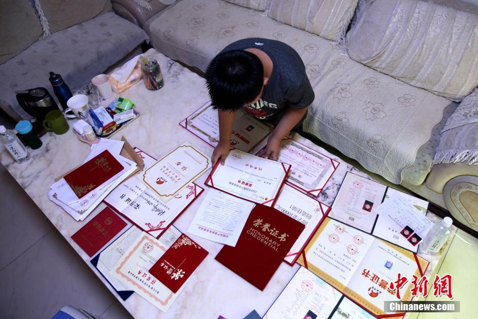 7月9日,杨砚希获得的音乐荣誉证书摆满了茶几。9岁的西安男孩杨砚希出生便被确诊为脑瘫,并患有先天性白内障,外婆王亚莉着力培养孩子,并发掘其音乐天赋。中新社记者 张远 摄