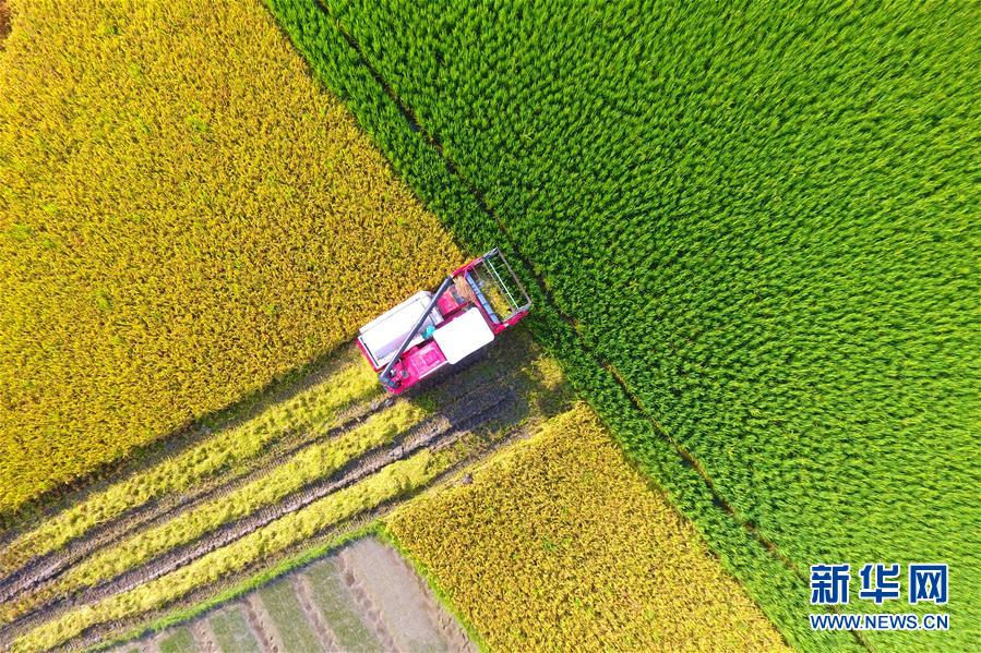 7月9日,在湖南省双峰县井字镇白碧村,农民驾驶农机收割早稻(无人机拍摄)。小暑过后,南方早稻陆续成熟,多地农民冒着酷暑抢收早稻、抢插晚稻。 新华社发(李建新 摄)