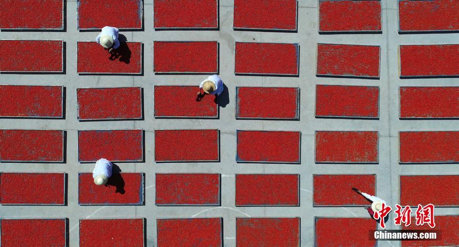 盛夏七月,甘肃张掖市临泽县万亩枸杞陆续进入采摘季,成熟的枸杞“染红”了戈壁滩。临泽县鸿宝康枸杞专业合作社的工人在采摘、晾晒枸杞。近年来,临泽县引导特色林果产业发展向荒漠、戈壁等非耕地转移,截至2017年底,全县红枣、葡萄、优质梨、枸杞、核桃等特色林果产业面积达14.8万亩,林果产品总产量达3.48万吨,产值达1.16亿元。张渊 摄