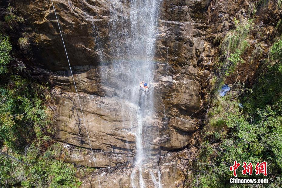 挑战者在悬崖瀑布上挑战速降。 杨华峰 摄