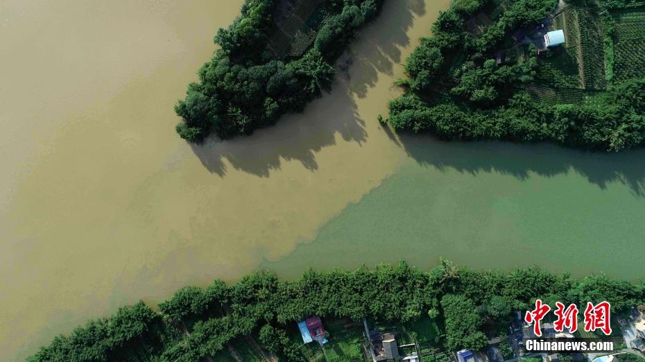 7月10日,因受强降雨影响,珠江上游融江广西柳州市融安县段水流浑浊,与水流清澈的浪溪江交汇时,呈现出一清一浑“泾渭分明”的景象。这是该河段今年第三次出现“泾渭分明”现象,前两次分别出现在3月19日和6月4日。