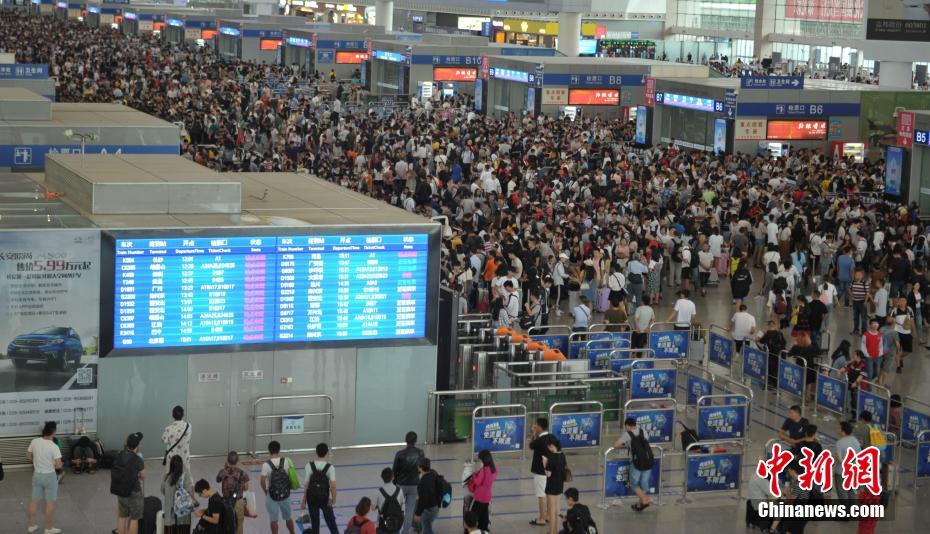 7月11日,受持续暴雨影响,成都、重庆经西(安)成(都)高铁线往返西安、南京等地的40趟次动车停运,旅客出行受阻。图为成都东客站候车大厅内聚留大量旅客。中新社记者 刘忠俊 摄