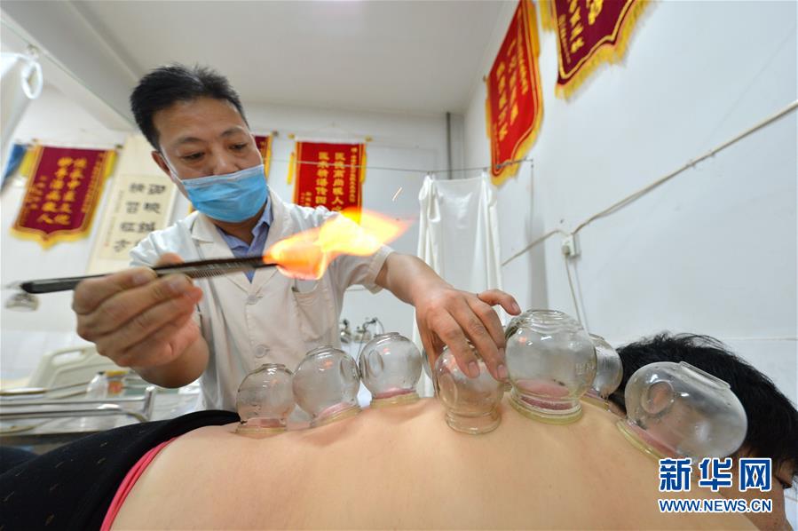 7月17日,市民在邯郸市峰峰矿区中心医院接受拔火罐治疗。 当日是入伏第一天,河北省邯郸市众多市民来到医院或诊所接受传统“冬病夏治”疗法。 新华社记者 王晓 摄